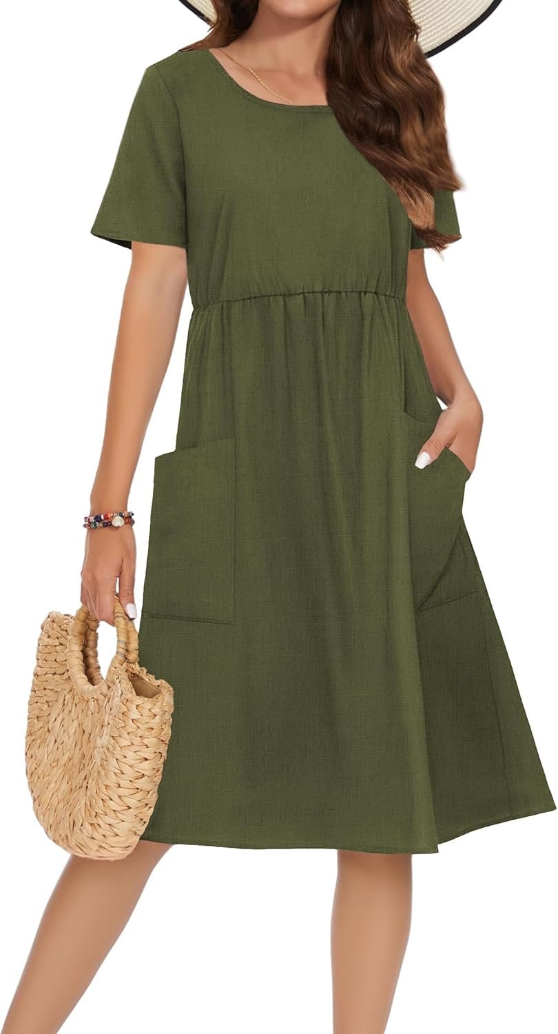 Womens Summer Midi Dress Casual Short Sleeve A-Line Cotton Linen Dress Beach Tunic Sundresses with Pockets 2025