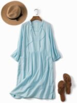 Womens V Neck Cotton Casual Loose Shift Tunic Smock Summer Dresses Vacation Dress 3/4 Sleeve Pocket